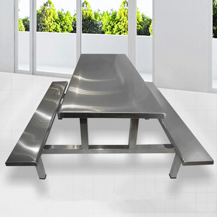 桌子是长条形连在一起的设计。这样做有两个好处:一是摆放起来很整齐,能让食堂看起来井井有条;二是同学们可以面对面坐在一起吃饭,交流起来很方便。桌子腿是“工”字形状的,我们特意把它做得比较扎实,这样桌子放得更稳当,即使坐满了人也不容易晃动。